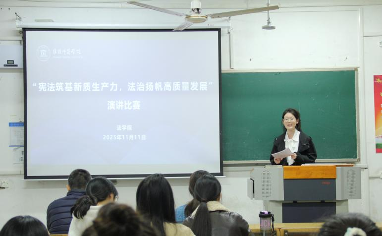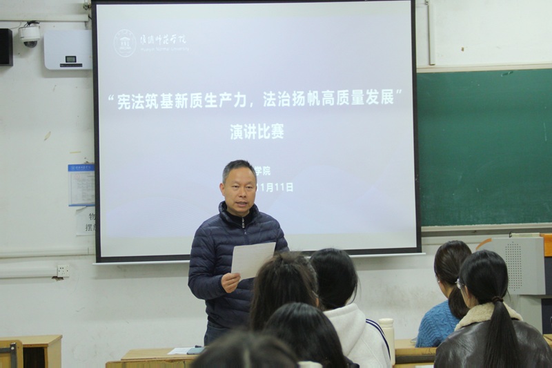 时值国家宪法日临近,11月11日下午,法学院在法律文化节期间组织以“宪法筑基新质生产力,法治扬帆高质量发展”为主题的演讲比赛。本次比赛由党委副书记李卓、团委副书记武美贤担任评委。